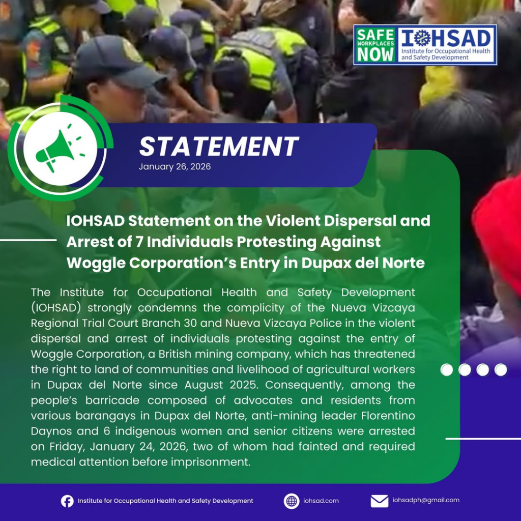 The Institute for Occupational Health and Safety Development (IOHSAD) strongly condemns the complicity of the Nueva Vizcaya Regional Trial Court Branch 30 and Nueva Vizcaya Police in the violent dispersal and arrest of individuals protesting against the entry of Woggle Corporation, a British mining company, which has threatened the right to land of communities and livelihood of agricultural workers in Dupax del Norte since August 2025. Consequently, among the people’s barricade composed of advocates and residents from various barangays in Dupax del Norte, anti-mining leader Florentino Daynos and 6 indigenous women and senior citizens were arrested on Friday, January 24, 2026, two of whom had fainted and required medical attention before imprisonment.